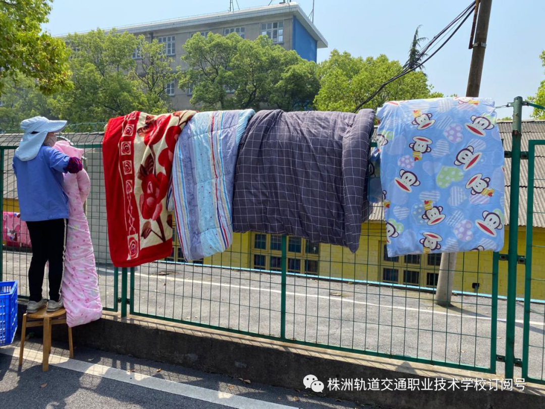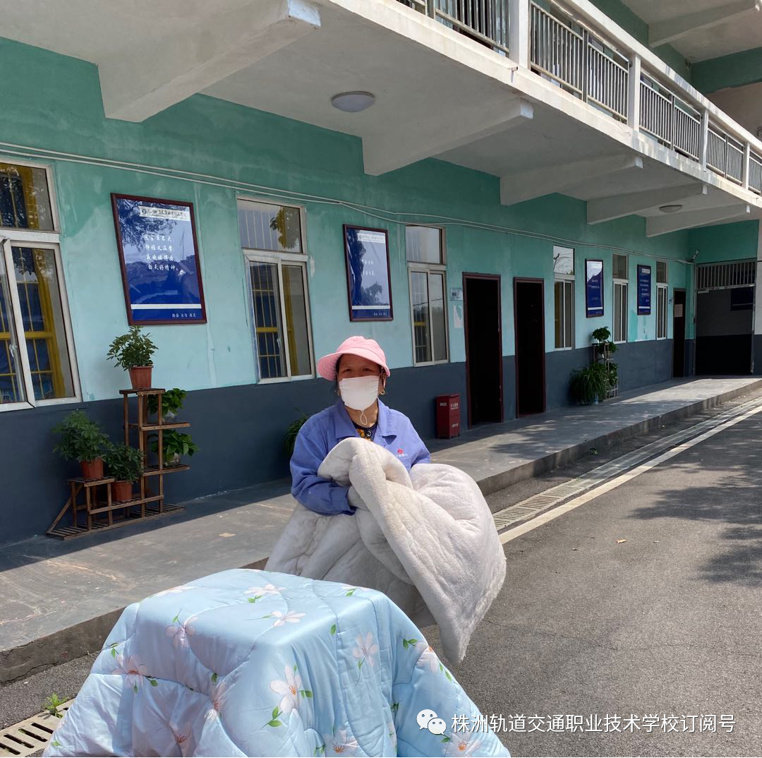 在湖南中職株軌學生返校之際,后勤阿姨們在這與花共舞的日子里,無暇領略四月的美景,扎扎實實的在學生宿舍搞衛生,幫忙曬床上用品。