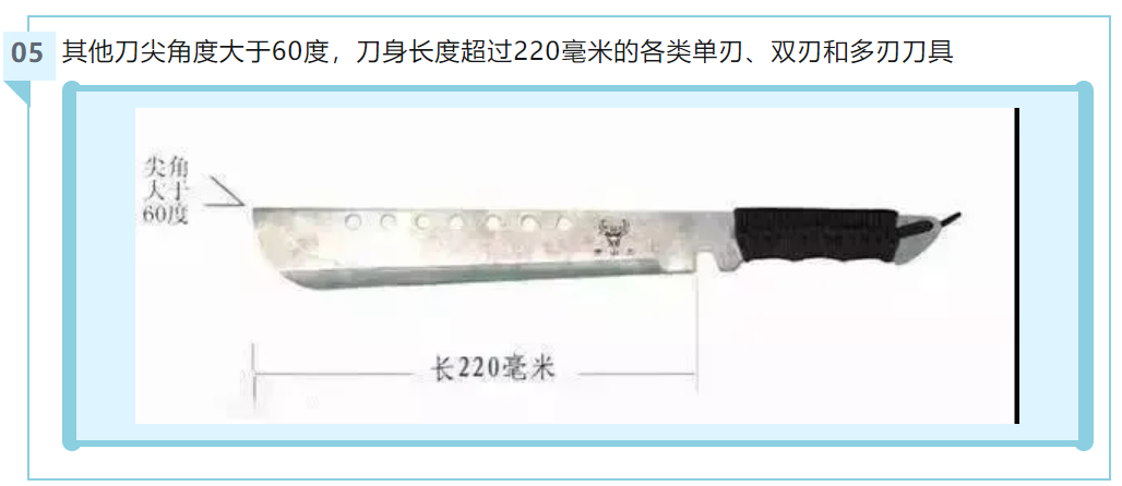 一、根據《公安部對部分刀具實行管制的暫行規定》,管制刀具是指:匕首、三棱刀(包括機械加工用的三棱刮刀)、帶有自鎖裝置的彈簧刀(跳刀)以及其它相類似的單刃、雙刃、三棱尖刀。凡符合下列標準之一的,可以認定為管制刀具: